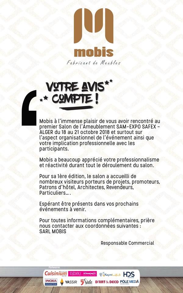 Le salon algérien de l’ameublement et d’accessoires de meuble « SAM EXPO » est organisé par IN’PULS event & expo organisateur d’événements grand public, réunit une nouvelle fois en Algérie exposants, grand public et professionnels du secteur de l'ameublement pour sa deuxième édition au palais des expositions SAFEX portes ouvertes pendant 4 jours,du jeudi 31 octobre au lundi 3 nov 2019.